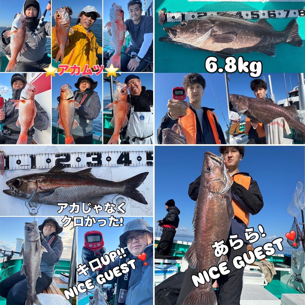 今日のアカムツは中盤までは小さいながらアタリはありましたが、針がかりしてくれず大苦戦💦難しぃ〜🤔そんな状況の中、ちょこっと盛り上がったのが、キロUPのクロムツと、竿を大きく曲げ、ドラグを出しまくった6.8kgのアラ❣️嬉しいゲストです‼️よくキャッチしてくれました👍本命が食って来ないならゲストでもと皆さま奮闘しましたが、後半からはアタリも止まり忘れたころに本命ポツリポツリと😥今日は本当に厳しい釣行になりました😞お疲れ様でした本日のご乗船誠にありがとうございましたm(__)m