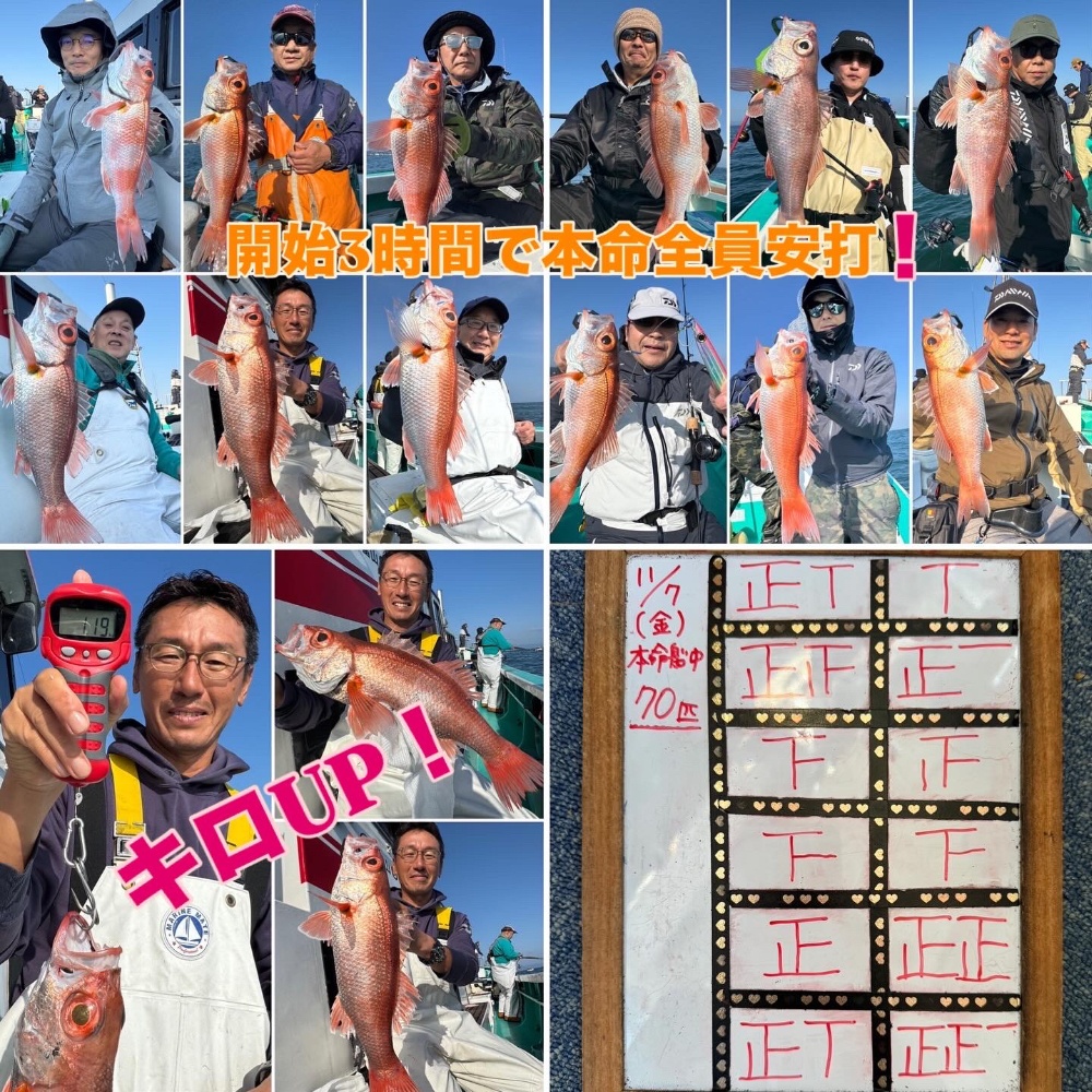 今日のアカムツは終始絶好調‼️開始わずか3時間で本命全員安打‼️しかもキロUPも飛び出し素晴らしい👏今日はアカムツの活性が良く、釣果に繋がらなかった方も、まわりを見ながら試行錯誤しながら和気藹々で、一日通して笑顔の絶えない釣行になりました😆✨※女将と息子は、タモ入れでクタクタになったとさ🤣本日のご乗船誠にありがとうございましたm(__)m